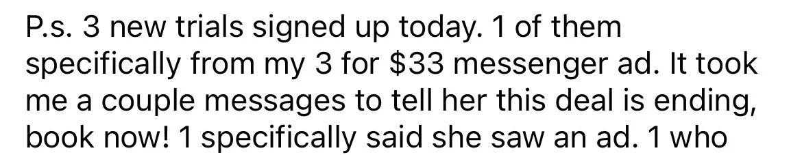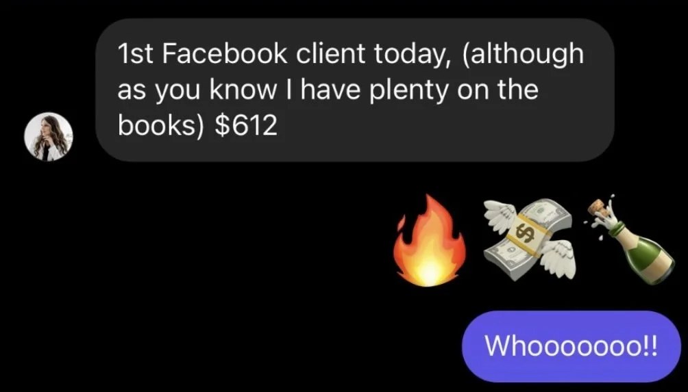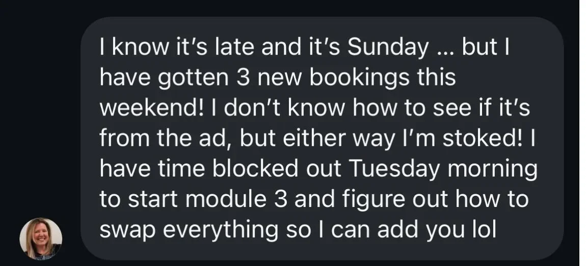 That's exactly why we start with small budgets ($1-10/day) and test everything before scaling. Just ask Jen, who spent just $16 per booking to fill her car detailing schedule, or Misty, who had to actually turn DOWN her ad spend because she was getting too many clients.